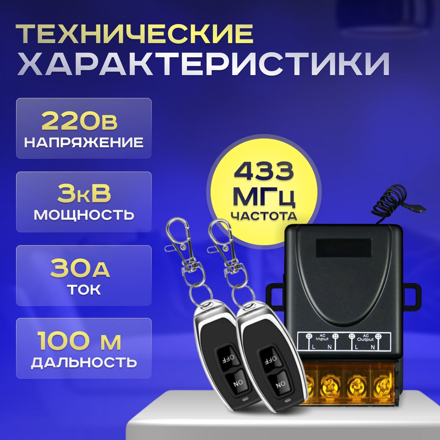 Радиоуправляемое реле 220В 30А 433МГц с двумя пультами дистанционного управления. Беспроводной выключатель.Реле для ворот, освещ