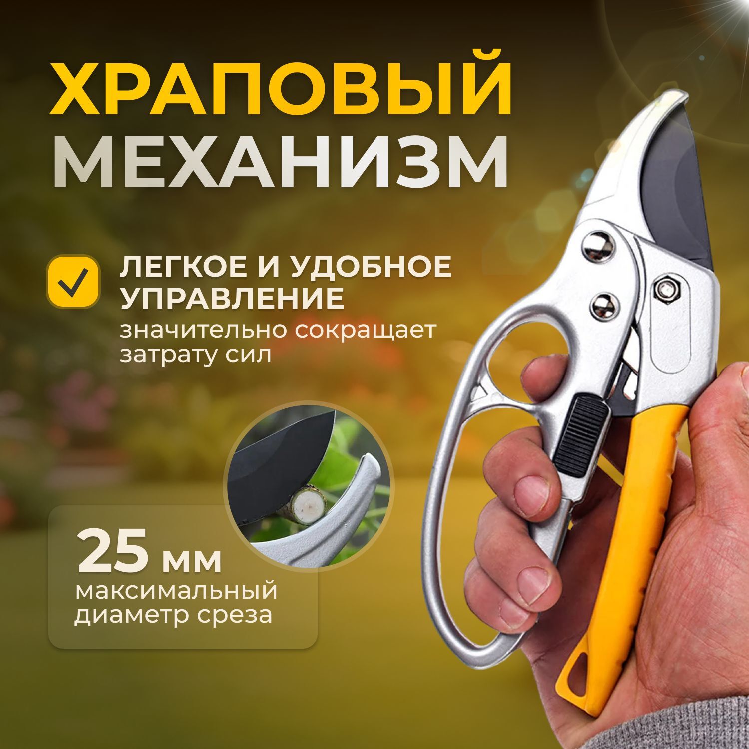 секатор; садовый; профессиональный; храповый механизм; обрезка; SK5; японская сталь; острые лезвия; тефлоновое покрытие; коррозия; поэтапная резка; деревья; сучкорез; порошковая окраска; TRP покрытие; сад; садовый инструмент; подарок; садовод
