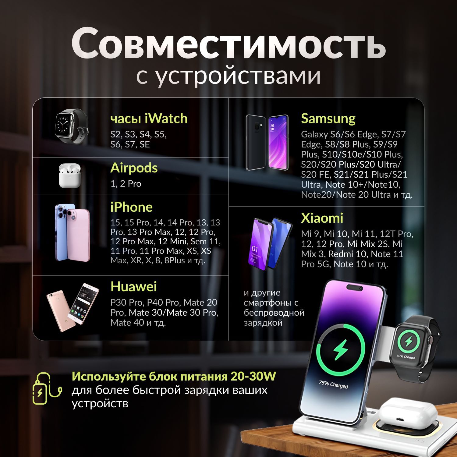 Беспроводная зарядка для iphone/ для телефонов Apple , Samsung, Xiaomi / Док станция с быстрой зарядкой для AirPods 2, 3, Pro и